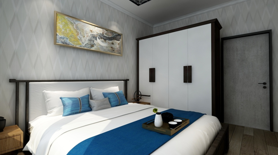 對于臥室來講沒有局限于傳統(tǒng)的暖色調(diào),而是用了稍許冷色配上中式家具,讓空間更顯得安靜祥和,灰色的墻面也使得空間更顯飽滿,增加了舒緩的氛圍。