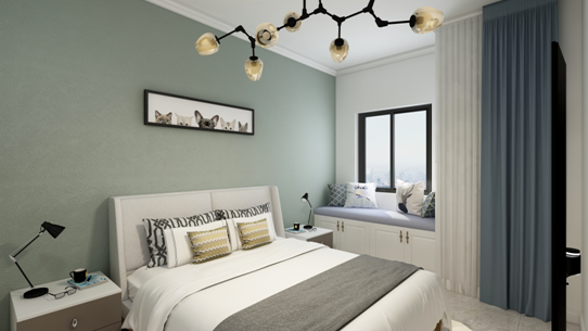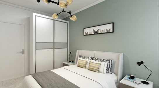 睡床是沿著窗戶擺設(shè),兩邊預(yù)留阿足夠的走動空間,床頭背景粉刷灰綠色墻漆,突出床頭背景,與地面地磚顏色相近,看起來甚是和諧。床品采用淺灰色軟包形式,增加臥室的舒適感,配上深灰色的床品床頭兩邊金屬材質(zhì)的臺燈凸顯了整個空間的大氣感,床旁邊有一個大大衣柜增加了整個屋子的儲物空間,臥室頂面采用石膏線,從視覺不會顯著壓頂.現(xiàn)代住所的開展,小家庭的組成,大家心理上的需求,期望臥室具有私密性、蔽光 性,配套洗浴,靜謐舒服,與住所內(nèi)其他房間分隔開來。我規(guī)劃的臥室除了主臥加了個內(nèi)衛(wèi)外,再者除了擺放雙人床外,留有必定的面積擺放臥室家私,如衣柜,電視柜,床頭柜,還留有必定空間能夠休閑活動