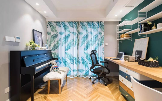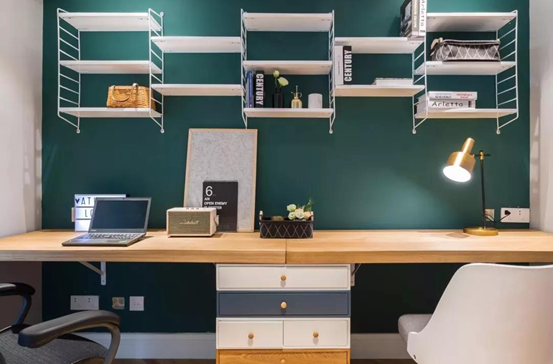 △位于客廳沙發(fā)背后的書房空間,灰色和青色的墻面形成對比,把鋼琴和書桌區(qū)域分開,墻面的置物架搭配雙人書桌的設(shè)計,滿足了書房的收納需求