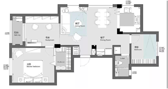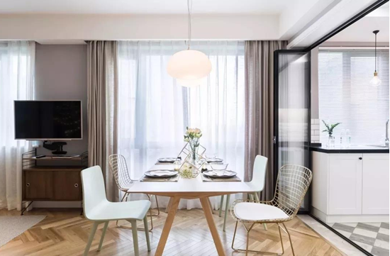 客廳的整個色調(diào)分為三個部分,一是墻面的淺灰色,低調(diào)中又帶點清新,二是吊燈的暖白色,干凈大氣,三是地板上的木色,三個顏色形成三個大色塊。客餐廳地面都是相同人字拼接的木地板,讓整個空間的整體感和縱深感得以提升。