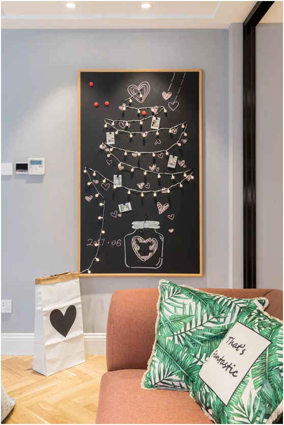 △書房和客廳之間的墻面還掛了一個小黑板,可以用來記錄屋主一家的點點滴滴,小串燈的“之”字形像是棵圣誕樹,讓這個地方多出了文藝小清新的感覺。