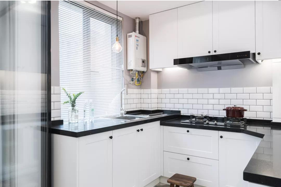 △用折疊式玻璃門將廚房和餐廳隔開,玻璃門既阻擋了油煙的蔓延,又保證了廚房的采光通透性,有利于做飯時家人之間的溝通。廚房門旁邊的仙人掌在空間上也起到了一定的隔斷作用。廚房內(nèi)部是U字型的櫥柜布局,白色的柜體、黑色的臺面、小白磚、灰色墻漆的運用,讓廚房層次分明,折疊門的使用也讓廚房平時更顯寬敞。