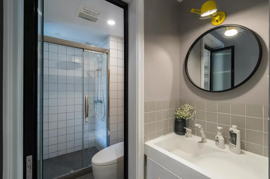 △衛(wèi)生間做了干濕分離,把洗手臺外移到衛(wèi)生間門外。地面和墻面還是主色調(diào)低調(diào)的淺灰色。馬桶和淋浴區(qū)之間也做了隔斷,再也不用擔心水汽的煩惱。圓形鏡子上有一個黃色的小臂燈,用來補充照明?!骷儼咨南词峙_和墻面的淺灰色小磚形成對比,臺面上放置了一個小花瓶,作為裝飾。