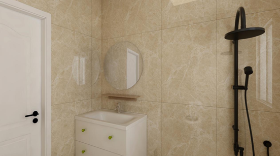 衛(wèi)生間在選擇瓷磚的時(shí)候選用了暖白色瓷磚,因?yàn)闃I(yè)主不希望空間太冷,馬桶朝向應(yīng)客戶要求調(diào)整了方向,貼心的考慮到了業(yè)主的生活起居。白色的木質(zhì)浴室柜,透露出自然與原始之美,能充分體現(xiàn)主人的家居檔次和身份的尊貴。