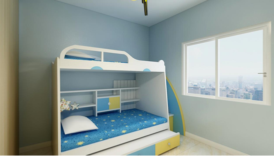兒童房 的設(shè)計(jì)以色彩豐富表現(xiàn)這個(gè)空間,因?yàn)槭悄泻⒆泳幼?/span> 所以壁紙運(yùn)用藍(lán)灰色調(diào),柜子上運(yùn)用下汽車的卡通造型更加符合男孩子的喜好,并設(shè)計(jì)了書柜和隔板層,方便以后孩子放置書籍畫冊(cè)和玩具的收納