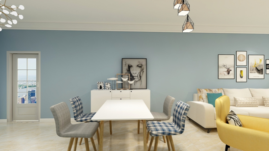 餐廳沒有從地面來區(qū)分,用頂面造型頂把客廳和走廊做了整體分割,裝上有幾何造型的裝飾吊燈,未安裝燈帶和筒燈,以實(shí)用性為主。墻上的的裝飾畫,能體現(xiàn)居著的簡(jiǎn)單心境,長(zhǎng)期受到字畫的熏陶,也能提升主人自身的文化檔次。