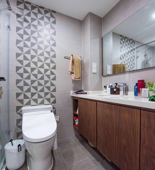 衛(wèi)生間的深淺搭配看起來很舒服,深色木質(zhì)浴室柜看起來更有質(zhì)感,淺色墻磚搭配深色腰線使整體空間更具層次感,坐便后面的背景設(shè)計(jì)使得整體空間看上去不再單調(diào)。整個(gè)衛(wèi)生間以業(yè)主的生活習(xí)慣為出發(fā)點(diǎn),簡潔大氣并具有功能性。