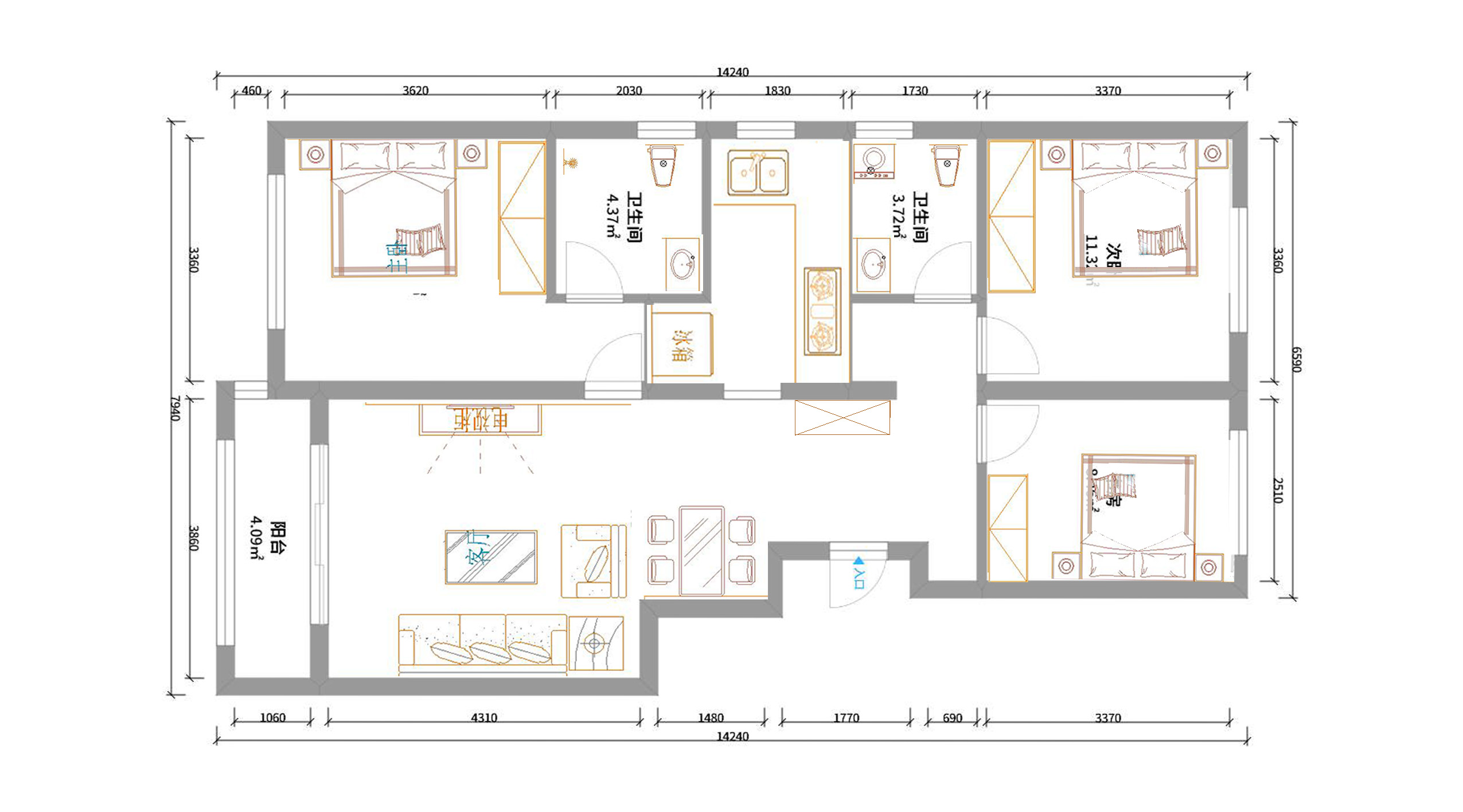 平面布置圖分析:進(jìn)門(mén)右手邊是一個(gè)鞋柜起到很好的收納作用,餐廳和客廳區(qū)域分離開(kāi)來(lái),廚房是一字形,把冰箱放到廚房里生活更便捷一些,主臥室放正常尺寸的雙人床和大衣柜保證充足的儲(chǔ)物空間,次臥室是女兒房想要個(gè)梳妝臺(tái)。