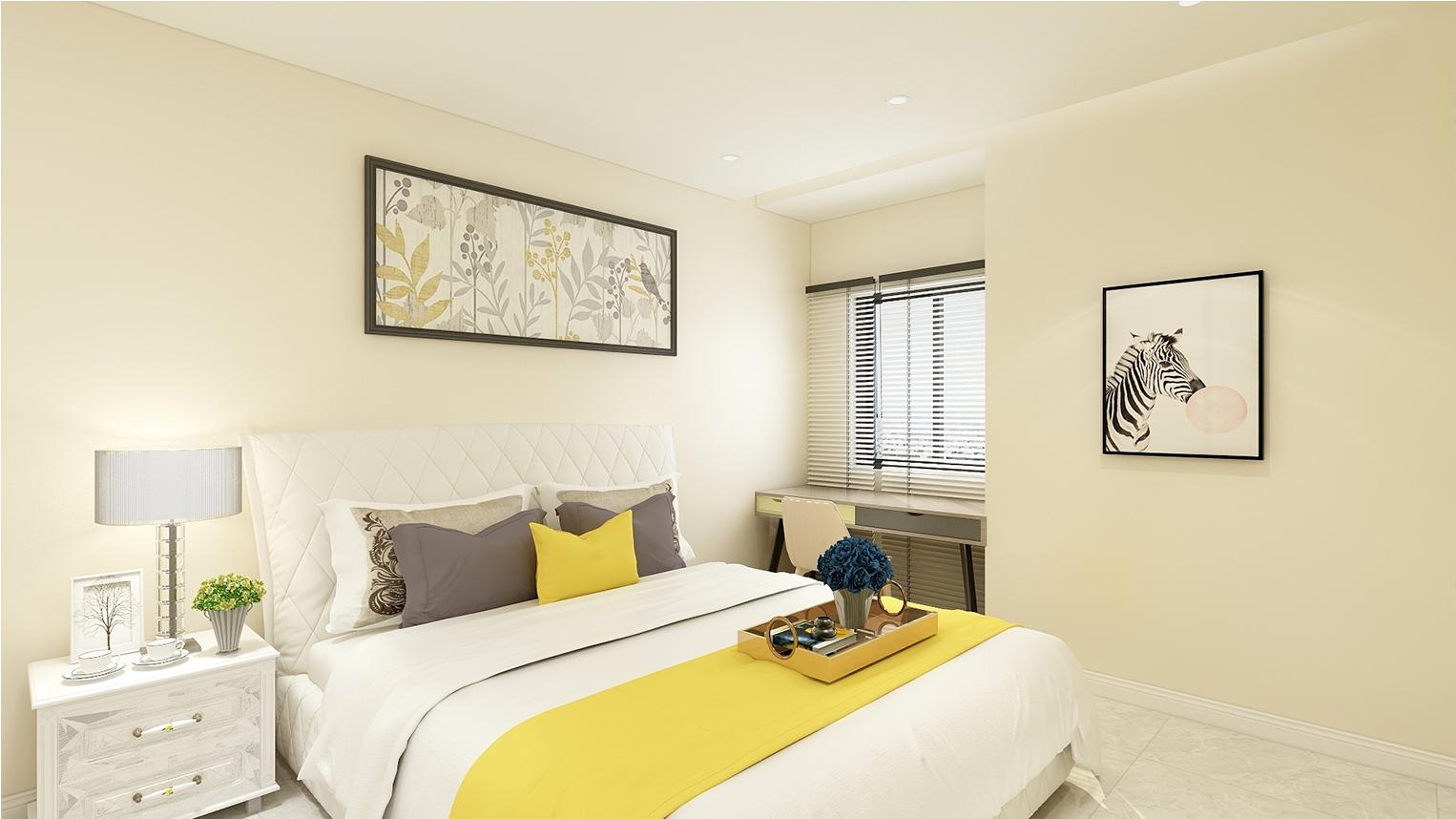臥室和整體風格統(tǒng)一,做到舒雅實用。采用冷色調(diào)的窗簾,在整體的暖色調(diào)里加入了少許冷色,是整個空間更加和諧,床也是采用的原木色的床,整潔干凈,而且顯得很溫馨,大方得體,深色的推拉門讓空間更具有穩(wěn)定性,床頭的掛畫也讓空間更有靈性,墻面用了暖黃色的壁紙加兩個小臺燈增加空間的采光,床單被罩是比較靈動的條紋圖案,主臥室還放了一個電視,可以滿足生活的小需求。灰色的地磚也讓整個空間的顏色更顯得高級,也是現(xiàn)在很流行的顏色搭配。