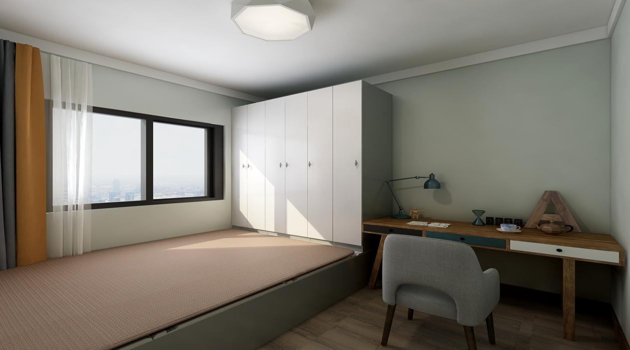 北書房做了一個(gè)東西方向通長(zhǎng)的榻榻米,衣柜和書桌在一條線上,整潔、方便、實(shí)用,北面兩個(gè)臥室的色系都做了調(diào)整,換成了冷色系,配上深色的木地板,是房間不會(huì)顯的太冷,而又富有質(zhì)感。由于榻榻米衣柜的限制,書房的窗簾只能選擇單窗簾向開啟。