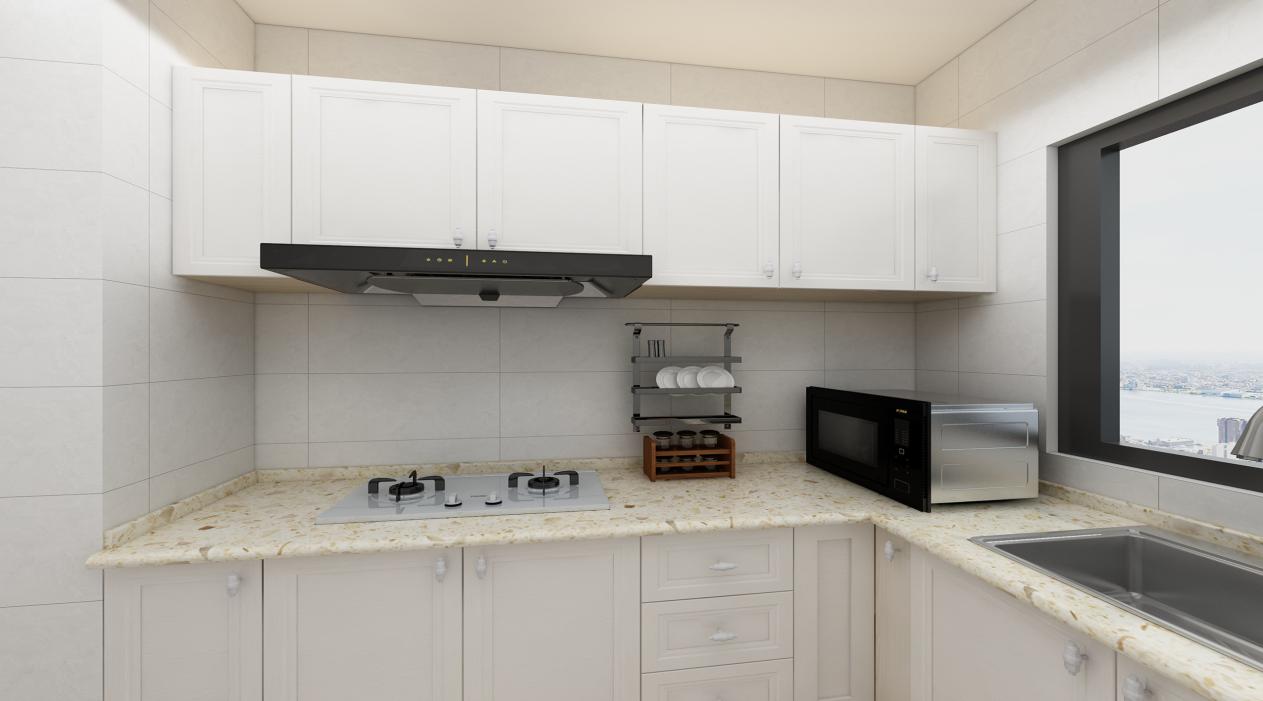 整體櫥柜實(shí)用為主,地面、墻面與頂面都以淺色調(diào)為主,搭配上淺櫥柜門板,顯得干凈整潔。水盆、操作臺(tái)和灶臺(tái)保證了洗切炒的順序,方便我們?nèi)粘J褂茫?/span>L形地柜+一字形吊柜,最大限度的增加了廚房的儲(chǔ)物空間。