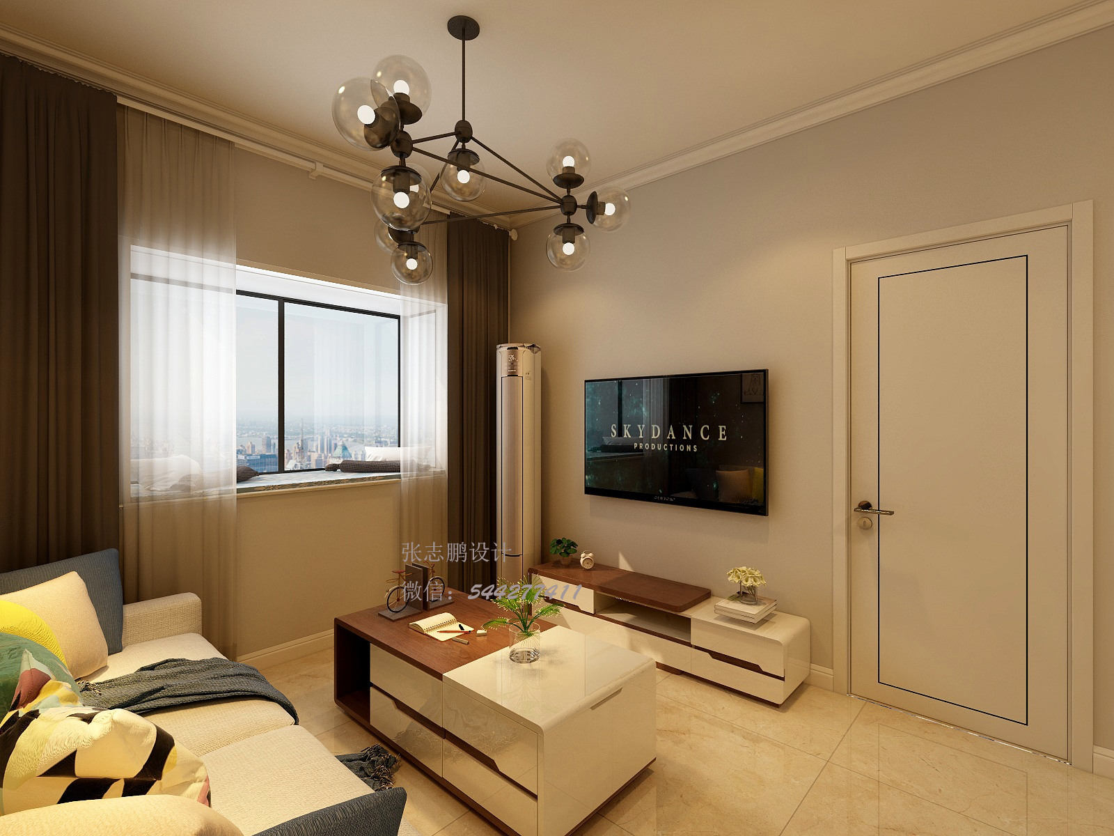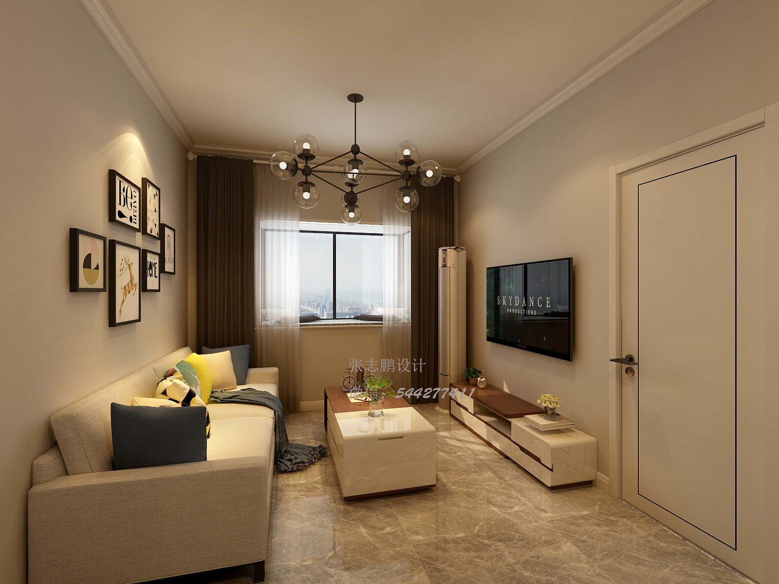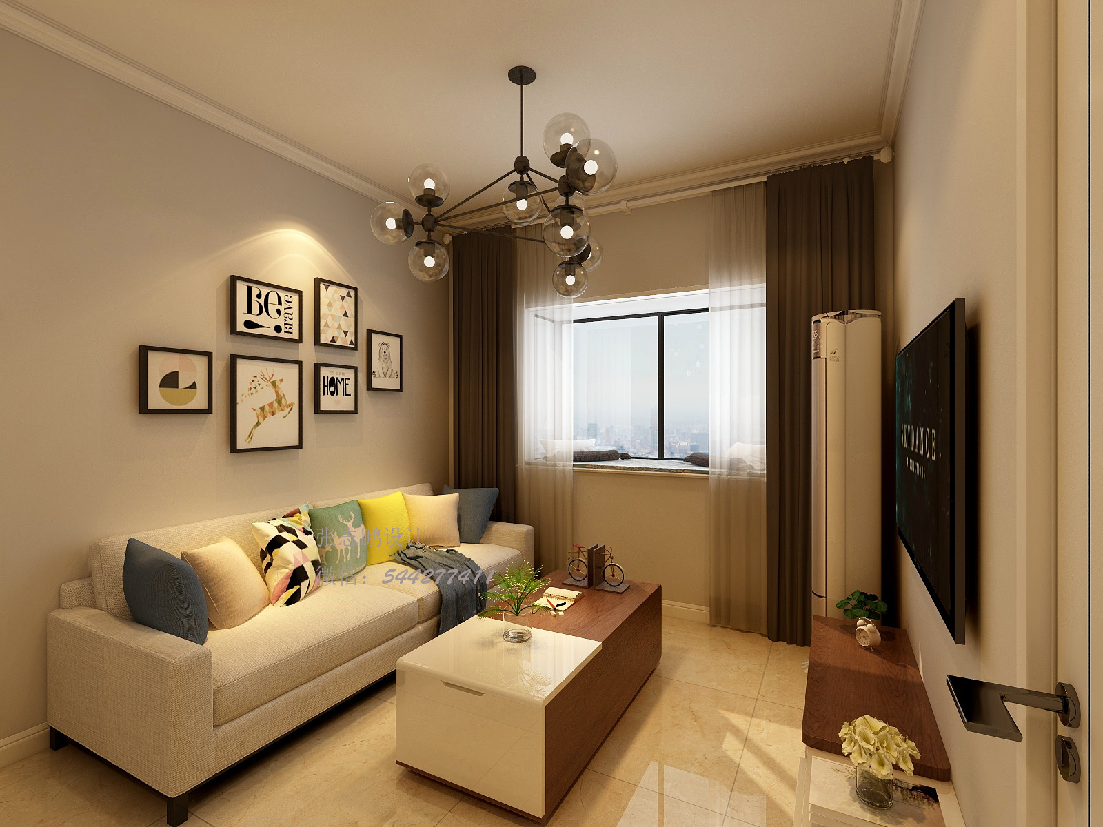 客廳上由于電視背景墻比較小,同時(shí)還要放置立式空調(diào)的原因,在設(shè)計(jì)上本著化繁為簡(jiǎn)的原則,舍棄了背景墻的設(shè)計(jì)。因?yàn)榭臻g的限制,無(wú)論做什么類型的背景墻,都會(huì)顯得局促和擁擠,會(huì)顯得很小氣。同理,頂面沒(méi)有做壓低頂面空間感的吊頂,而是做了石膏線,來(lái)美化墻頂面的交界線,同時(shí)整體色調(diào)上以淺色為主,鮮艷活潑的顏色作為點(diǎn)綴,突出年輕人使整個(gè)空間顯得明亮大氣。