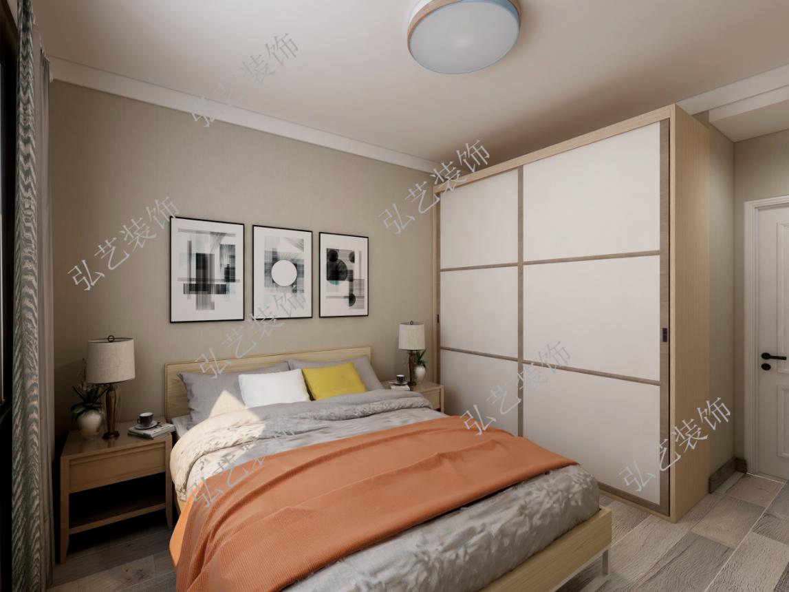 2:主臥室的墻面顏色和家具顏色也是以淺色為主,由于空間不算小,在考慮多個方案后,感覺還是把衣柜放到了床對面的那面墻,這樣的話不僅空間布局合理,而且滿足的功能更多,能增加更多的儲物空間。