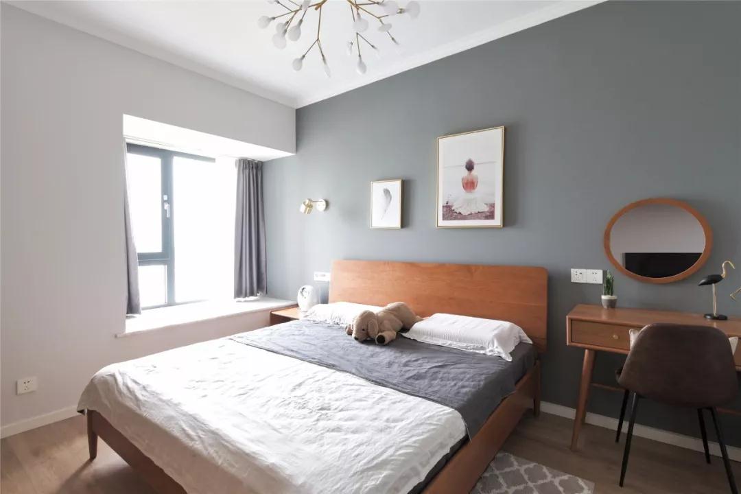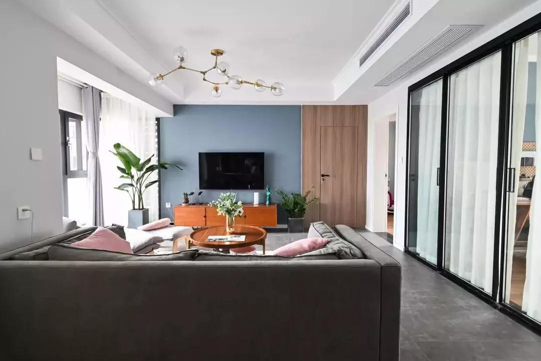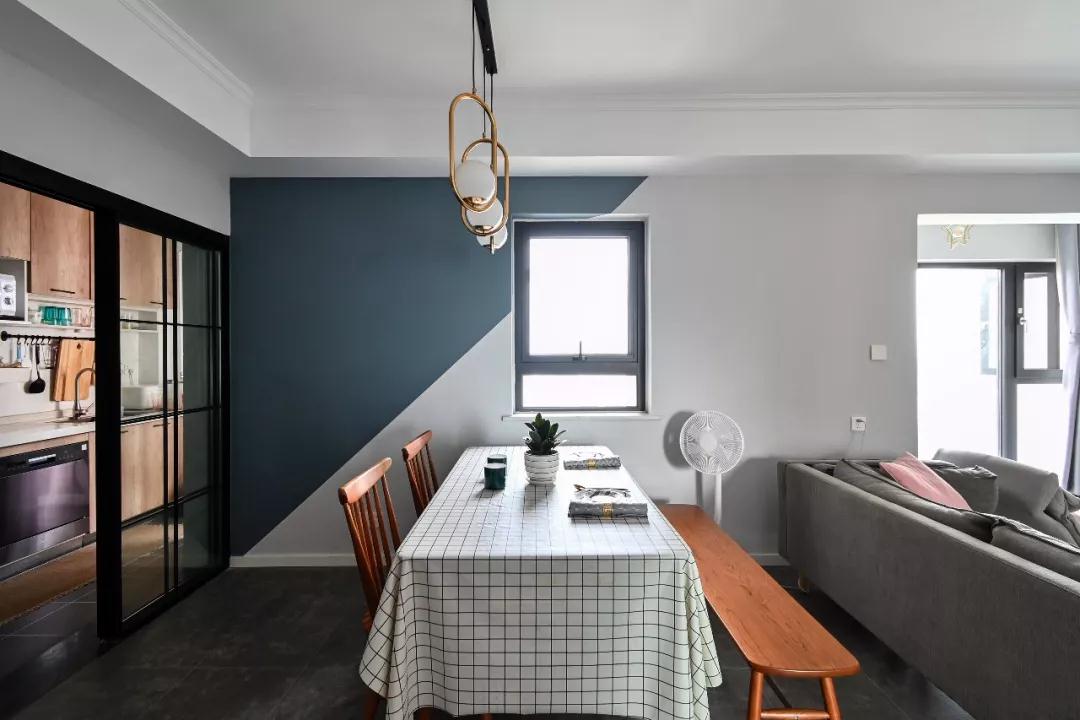 客廳電視墻以及餐廳都使用了灰藍色乳膠漆,整體統(tǒng)一協(xié)調(diào),具有空間連貫性。