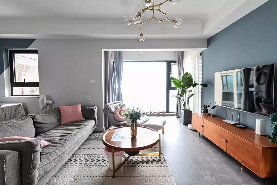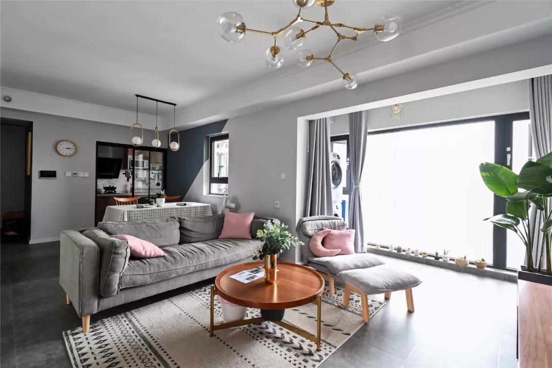 大橫廳的格局,客廳網(wǎng)紅分子燈與餐廳金屬吊燈相呼應(yīng),簡約而舒適的灰色沙發(fā)點綴以粉色抱枕,簡單不失活潑。幾何圖案的地毯,豐富了整個區(qū)域的視覺感受。