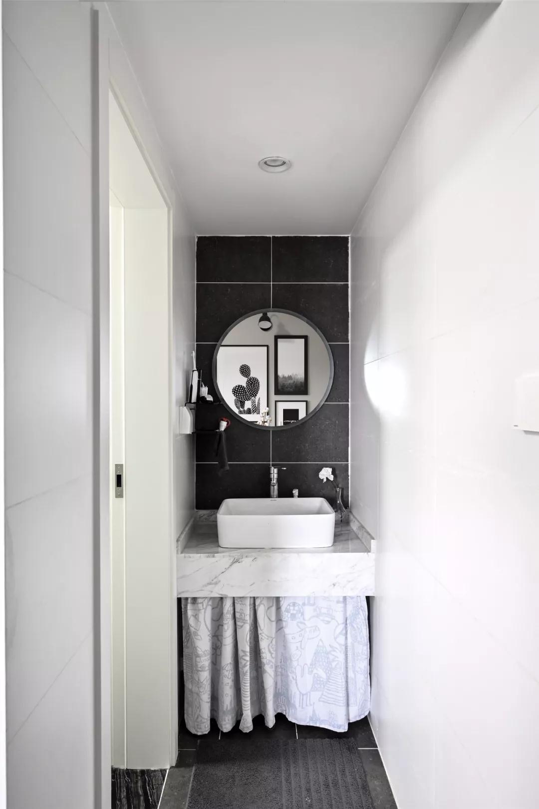 衛(wèi)生間采用了干濕分離的設(shè)計,簡約而不簡單。采用簾子取代傳統(tǒng)的柜體,使空間看起來柔和了很多。