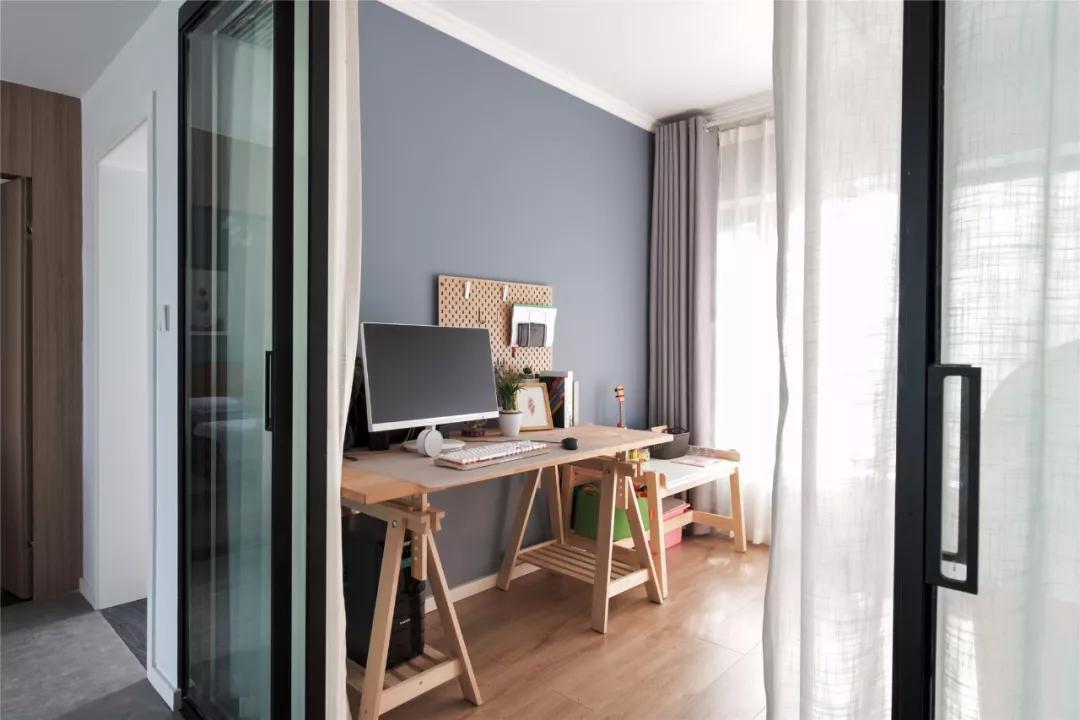 將一整面墻拆掉后,用黑框玻璃門加紗簾的組合,確保了辦公區(qū)域的隱私性,墻面顏色呼應(yīng)了餐廳區(qū)域,更有連貫性。