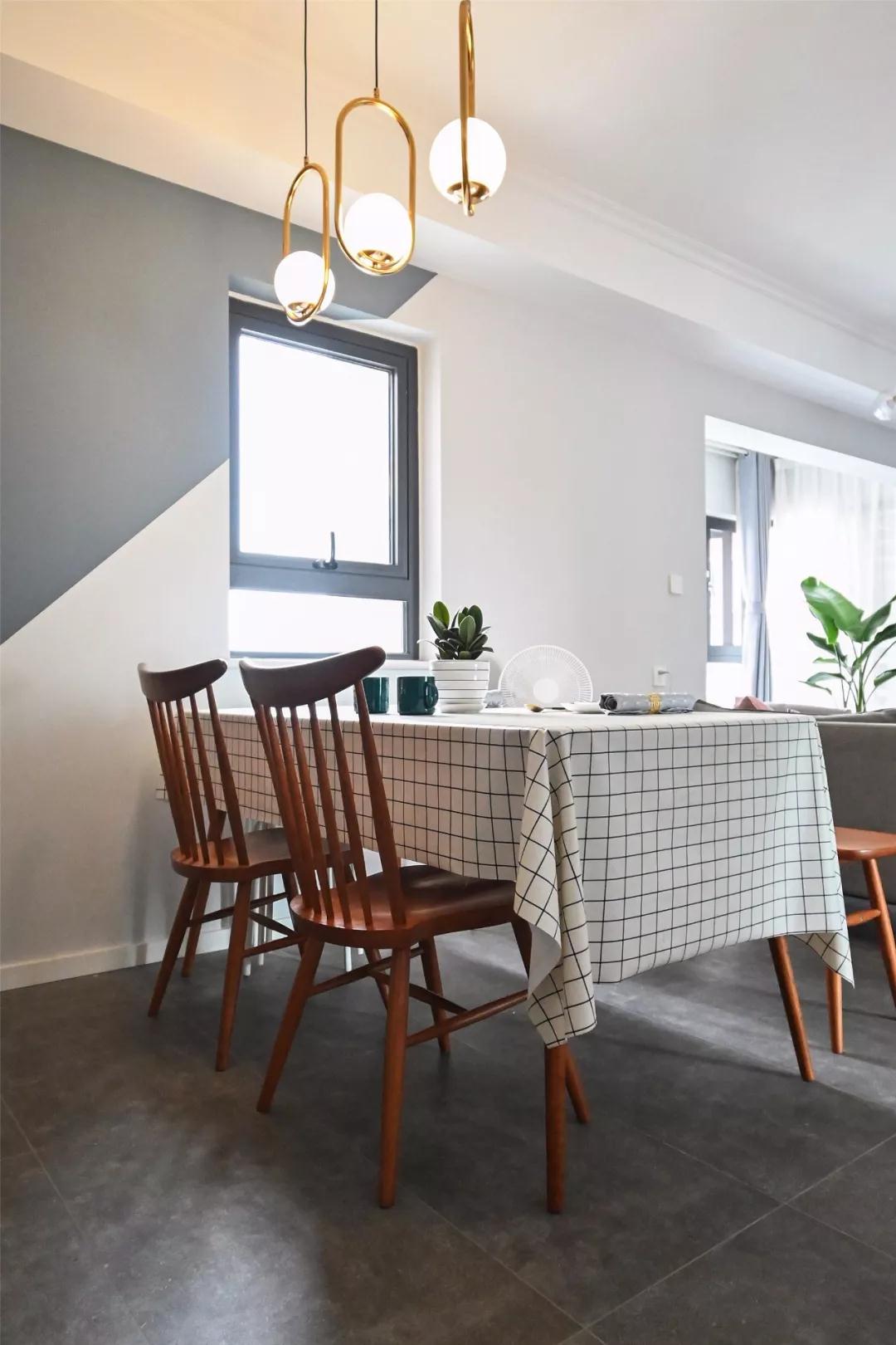 餐廳,墻面顏色進行斜向的拼色處理,非常有造型感。長條形的餐桌搭配木質(zhì)長板凳+網(wǎng)紅溫莎椅,營造出一個溫馨的就餐空間,同時可以容納更多客人聚餐使用。