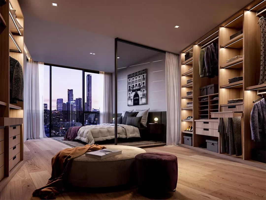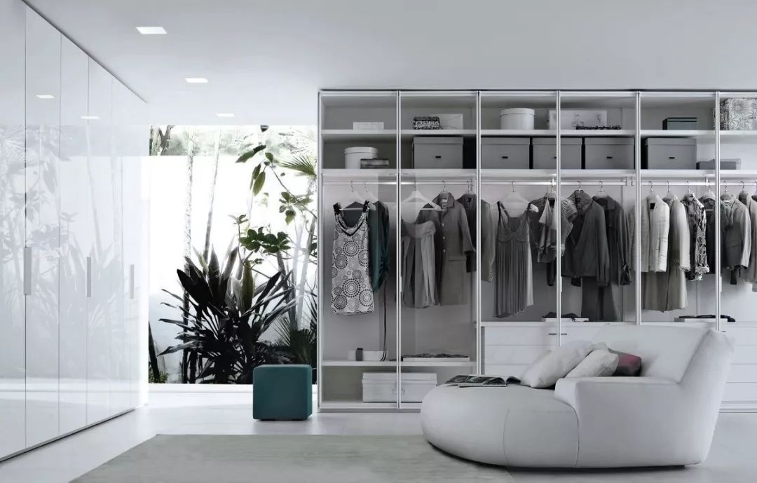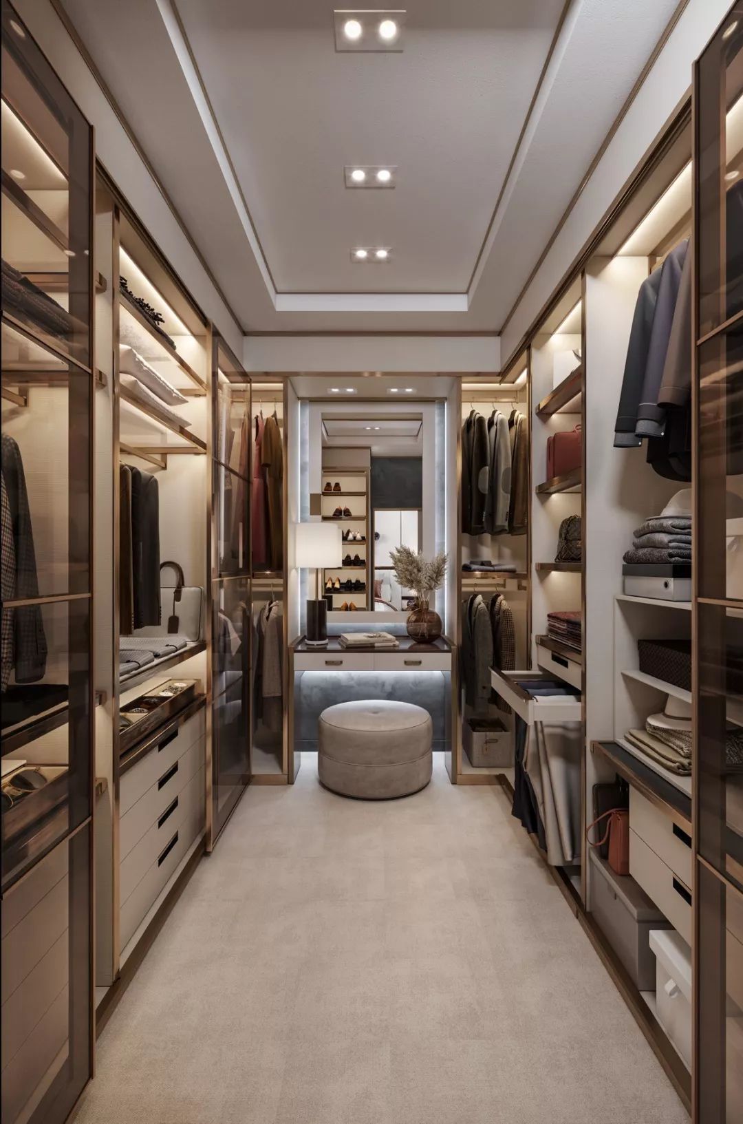 步入式衣柜起源于歐洲,與一般衣柜相比,其儲(chǔ)放空間更完整,衣物取用也更加便利。但因?yàn)樗粌H要有足夠的儲(chǔ)物空間,還要預(yù)留給使用者行走的通道,因此在豪宅中更為流行。