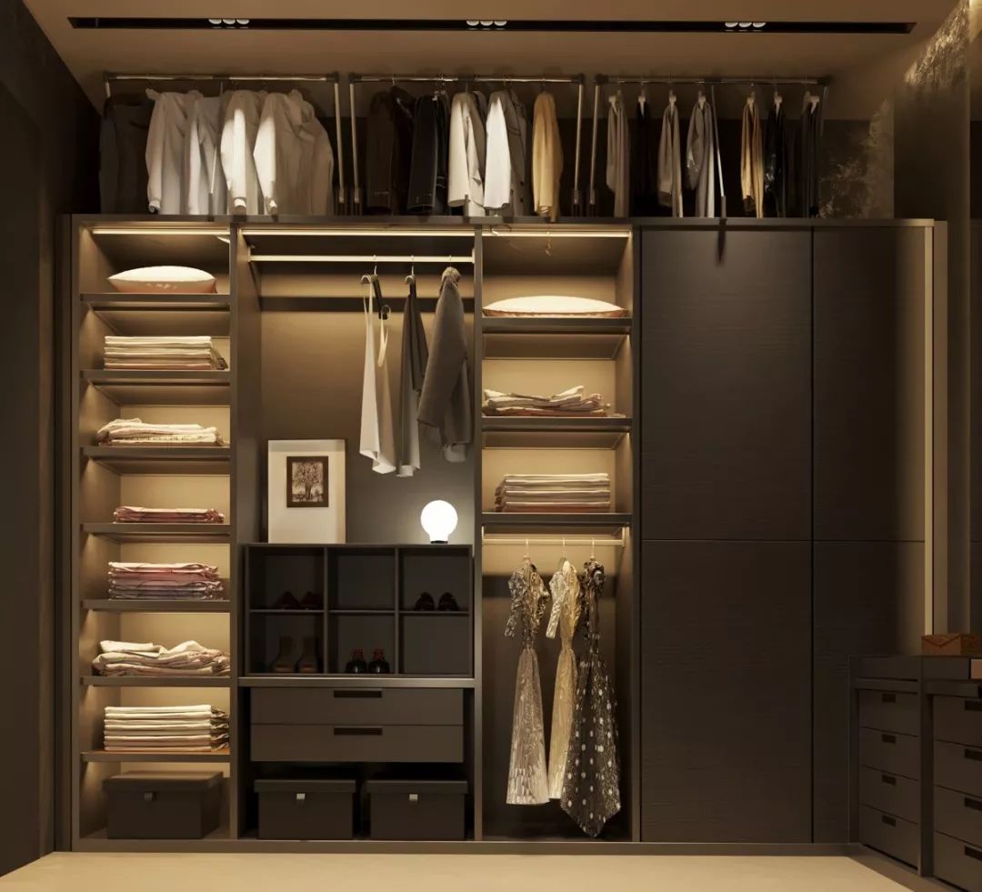 衣帽間的中層空間可以放置西裝、大衣、外套等,盡可能多預(yù)留出掛衣空間,并根據(jù)衣服的長(zhǎng)短分上下橫桿吊掛。