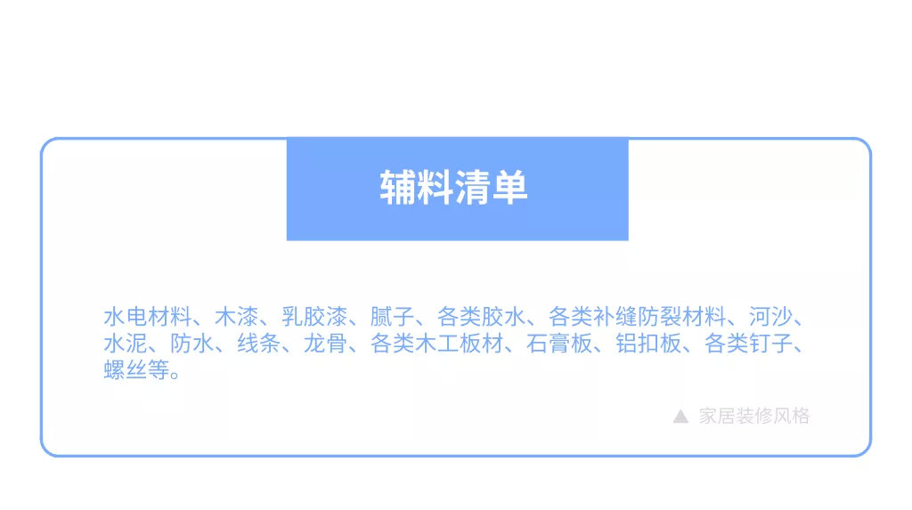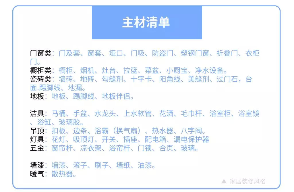 然后購買主材、輔材(如下圖)和開工前可購買的材料,如地?zé)岵膳诩已b之前施工完畢;中央空調(diào)開工之前最好能先定下;櫥柜在水電改造開工前購買;暖氣在設(shè)計(jì)方案確定后購買。