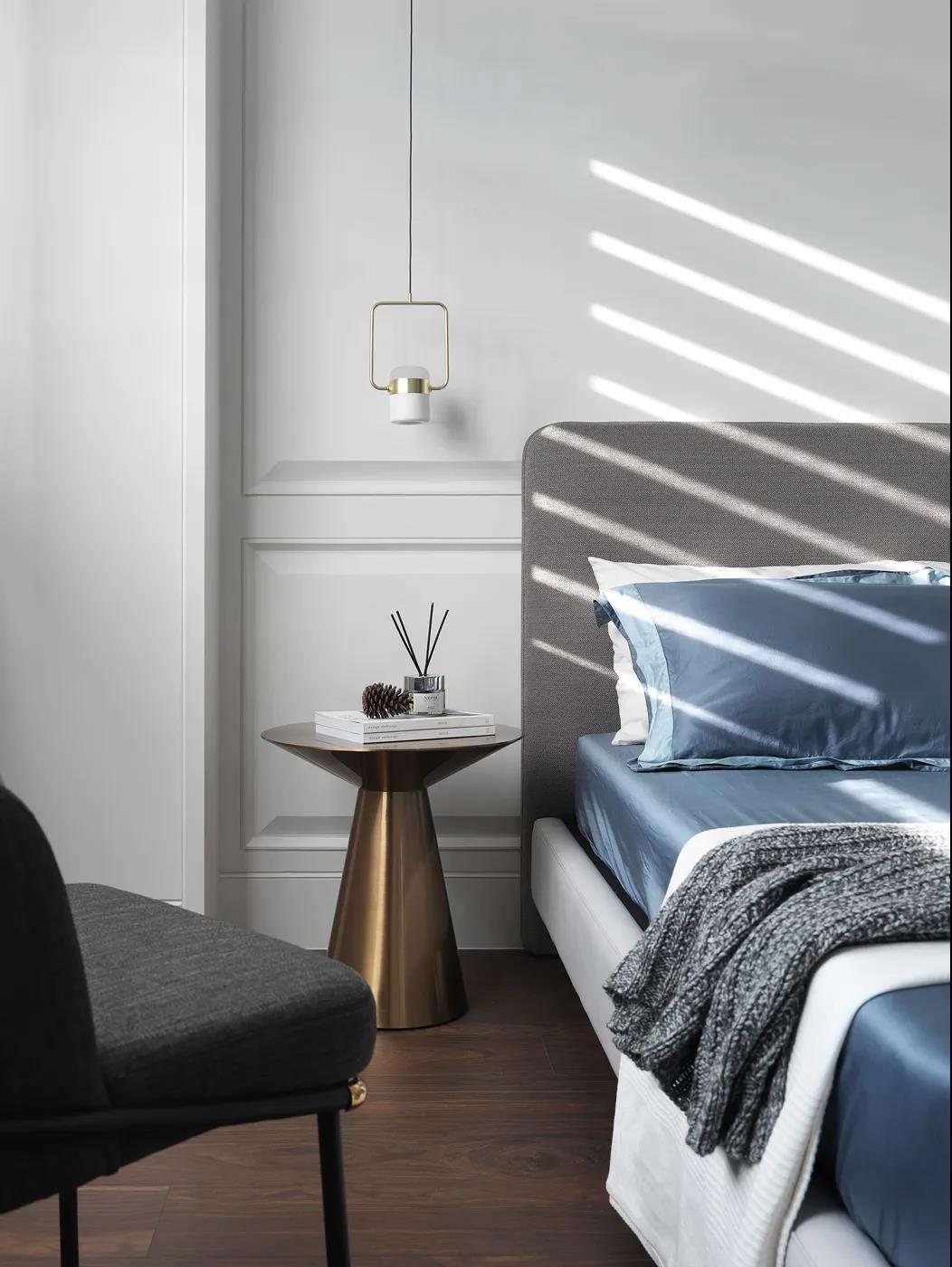 臥室床頭墻以帶邊框造型的飾面板基礎,布置布藝床鋪與金屬質感的床頭柜,讓睡眠空間充滿華麗端莊的大氣感。