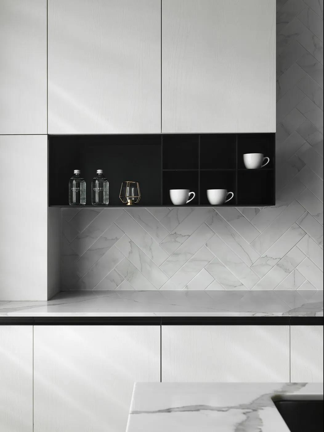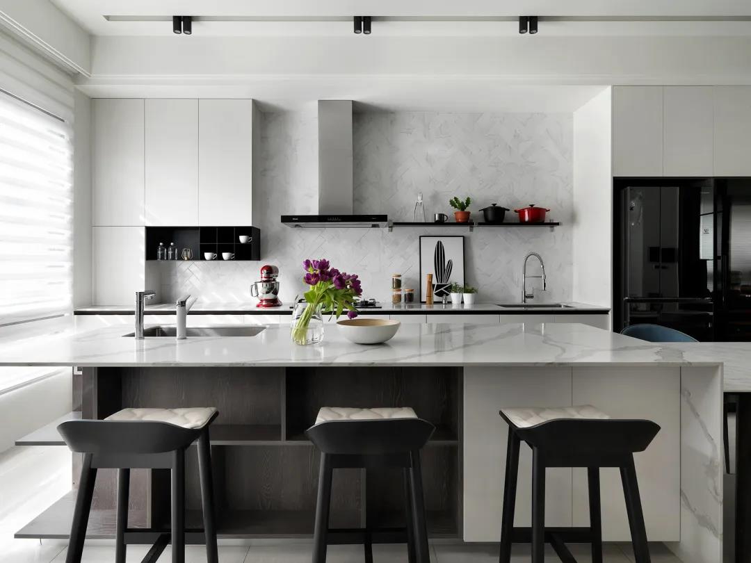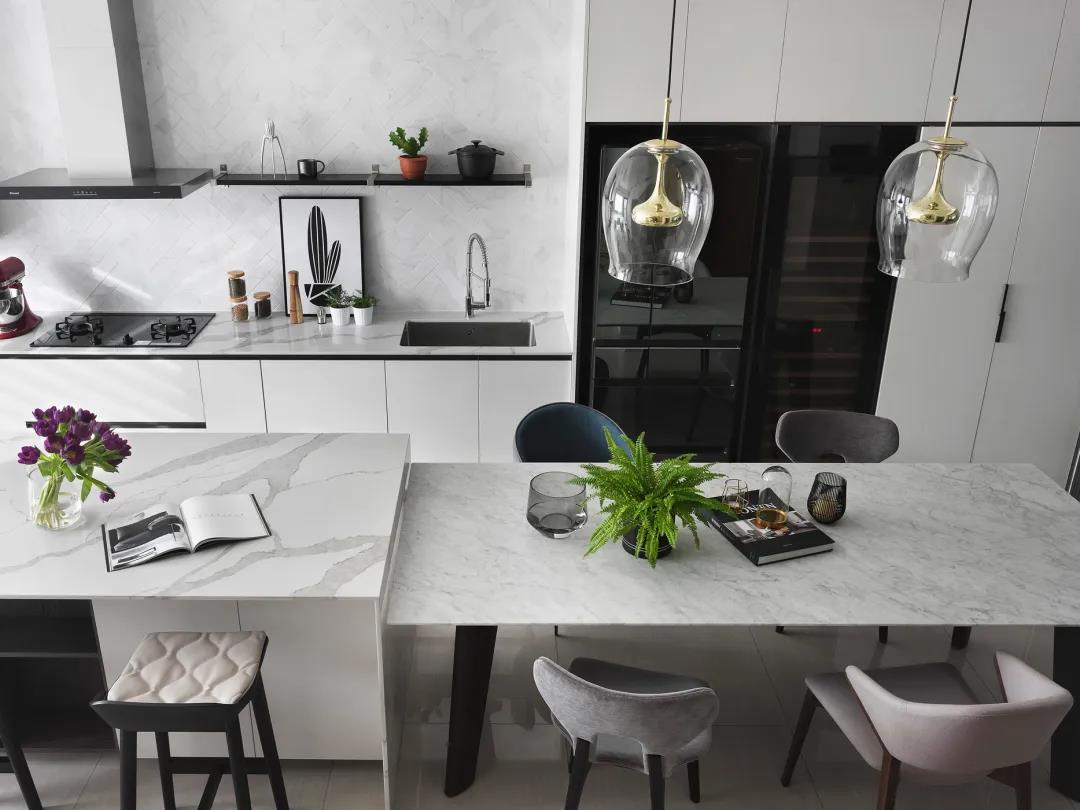 ▲挨著餐桌的中島臺,布置上幾張吧椅,營造出一種時尚優(yōu)雅的餐廚體驗。