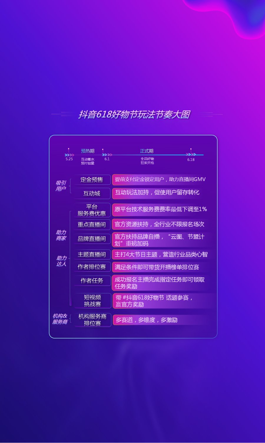 據(jù)抖音電商活動(dòng)運(yùn)營(yíng)高級(jí)總監(jiān)范瑞真介紹,從5月25日開(kāi)始至6月18日,抖音618好物節(jié)將分為2個(gè)階段。5月25日至5月31日為活動(dòng)預(yù)熱期,平臺(tái)會(huì)推出吸引用戶的定金預(yù)售和互動(dòng)城玩法,為活動(dòng)蓄水,預(yù)付鎖量;6月1日-6月18日為活動(dòng)正式期,會(huì)推出助力商家達(dá)人的平臺(tái)服務(wù)費(fèi)優(yōu)惠,重點(diǎn)、品牌、主題直播間獎(jiǎng)勵(lì),短視頻話題挑戰(zhàn)賽,全民玩法以及機(jī)構(gòu)服務(wù)商排位賽等。