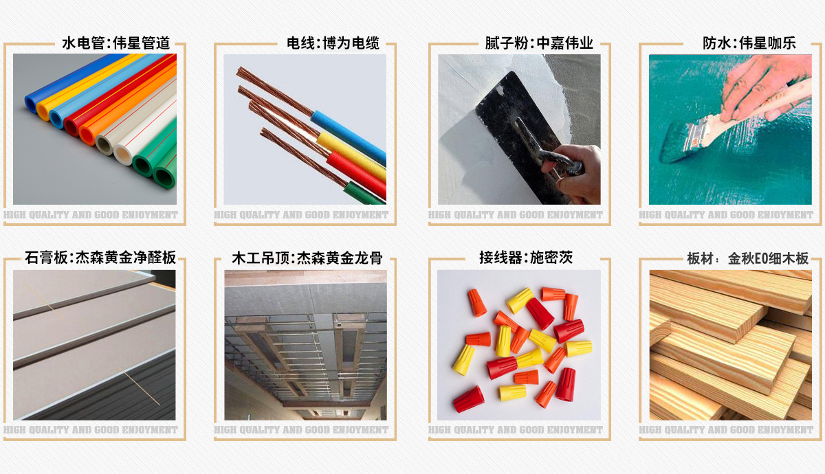 | 潔具 | 惠達、歐路莎、恒潔、箭牌 | 四件套(浴室柜、龍頭、花灑、坐便器、鏡子)標配角閥軟管及安裝 |